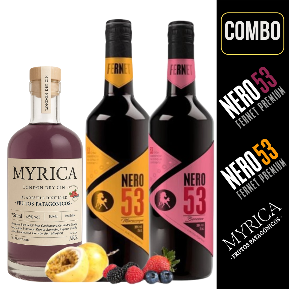 COMBO FERNET NERO 53 MARACUYA + MYRICA GIN FRUTOS PATAGONICOS + FERNET NERO 53 BERRIES